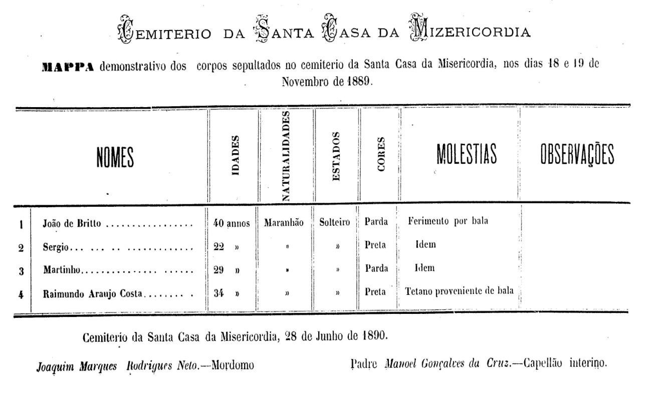 O registro hospitalar descreve os homens que morreram no conflito como homens solteiros, naturais do Maranhão, de cor preta ou parda. João de Brito, Sergio, Martinho, Raimundo Araújo Costa provavelmente estavam entre os líderes do protesto, pois foram atingidos na linha de frente. Os dados acerca dos feridos nos ajudam a interpretar a ocorrência de um verdadeiro massacre, pois as vítimas foram atingidas em partes do corpo como o peito, braço, antebraço, elemento que qualifica a intenção efetiva de matar e não apenas amedrontar ou dispersar a multidão.