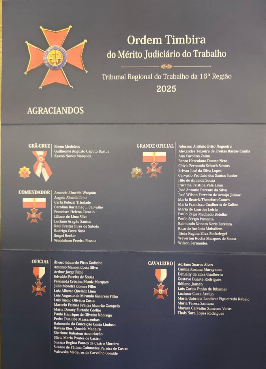 A comenda da Ordem Timbira do Mérito Judiciário do Trabalho é a mais importante honraria concedida pelo Tribunal Regional do Trabalho da 16ª Região (TRT-MA). E esse ano, a solenidade de outorga da Ordem Timbira será nesta quarta-feira (19), às 10h, no Auditório Ari Rocha, localizado na sede do Tribunal, no bairro da Areinha, em São Luís.